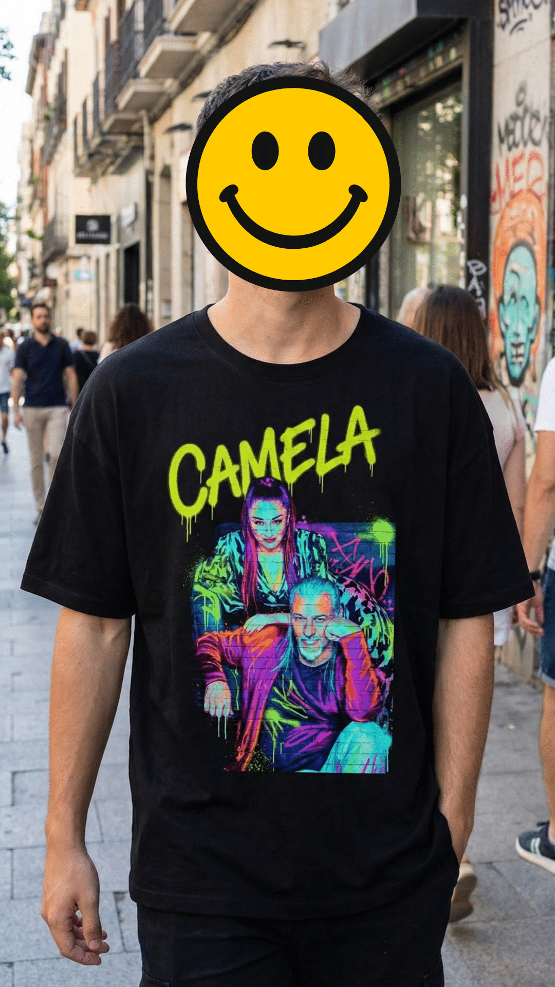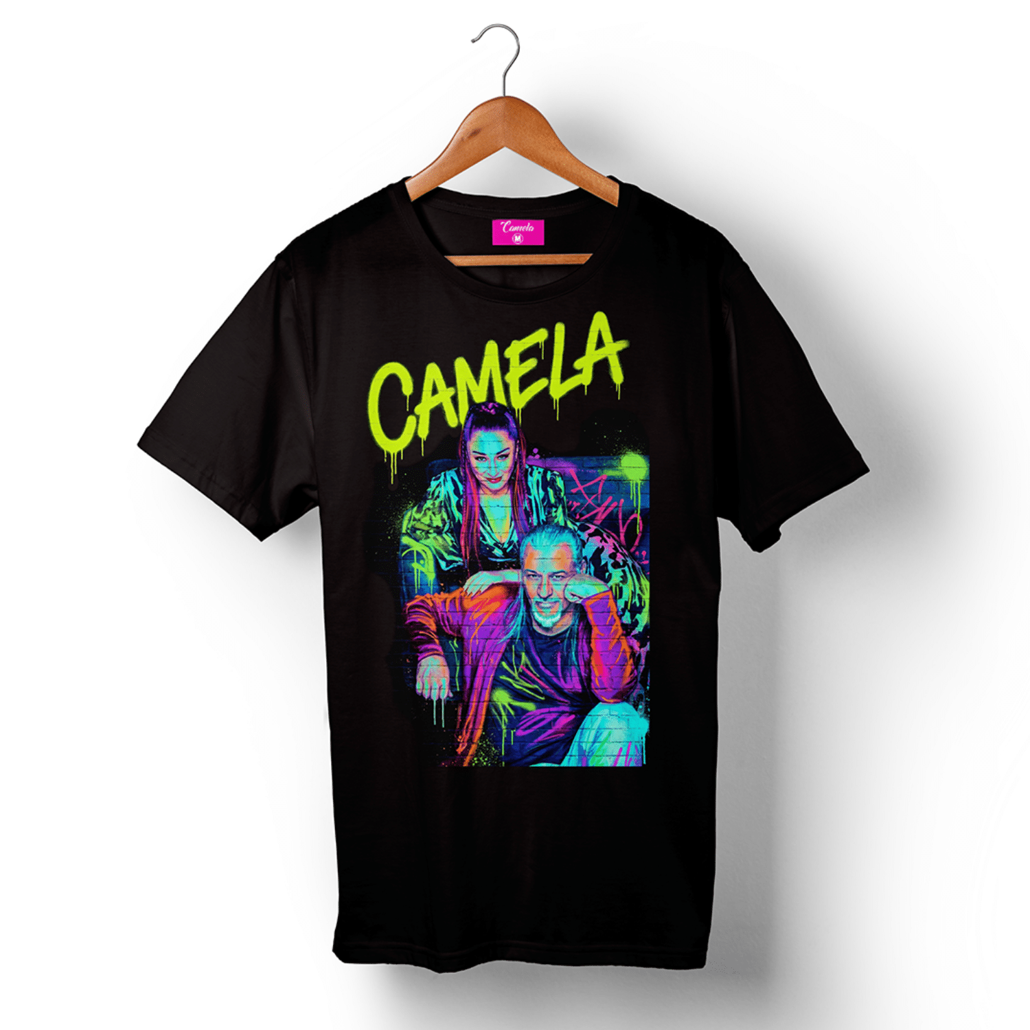 Camiseta Camela de color negro con uno de nuestros diseños más potentes: impresión frontal XXL a todo color y toda la energía que nos representa.